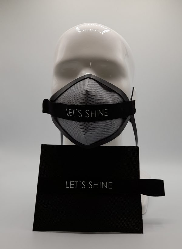 Bozal Ecopiel Gris Marino contorno, incluye sujeción de oreja con elástico quirúrgico Negro, correa incorporada.
