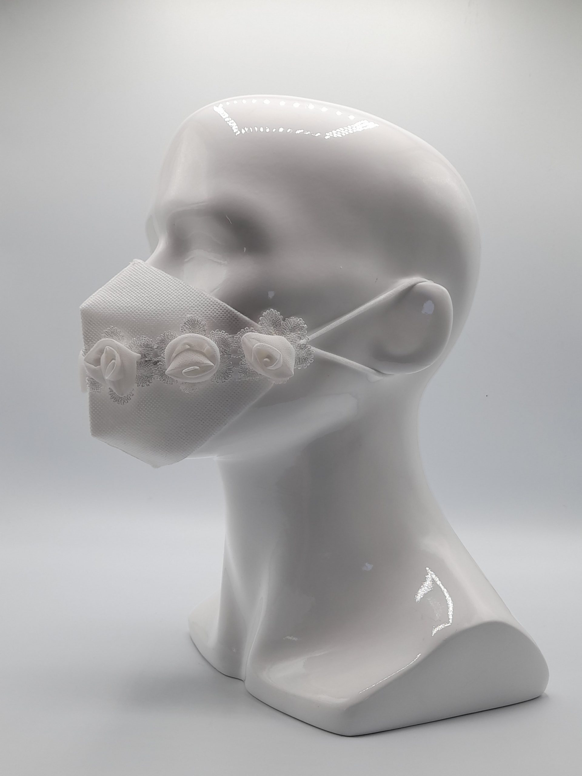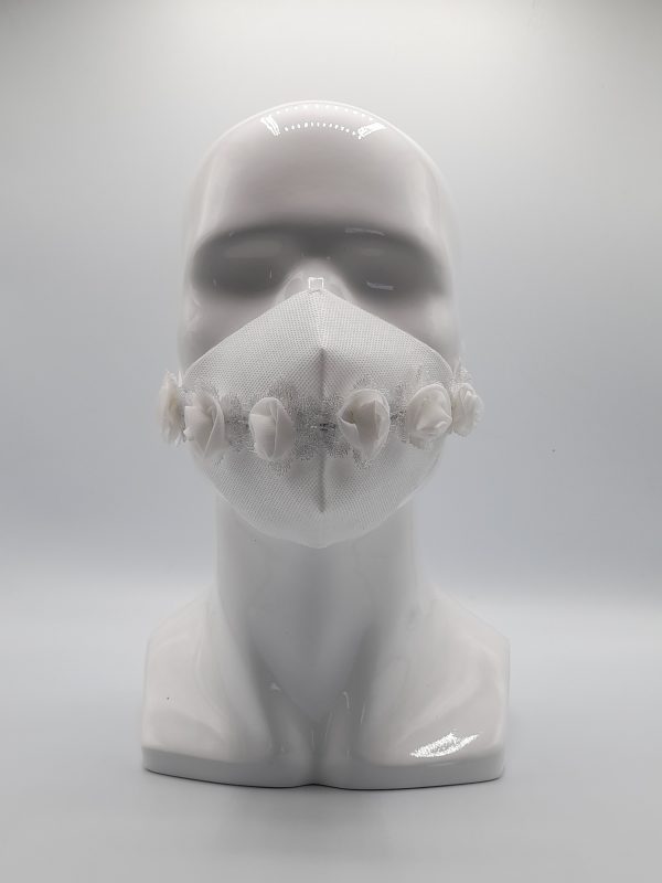 Mascarilla de diseño con base de TNT (tejido no tejido) 100 gr. doble capa blanco. . Cinta de Flores Blanco. Inculye Funda guardapolvo. Packaging Especial.