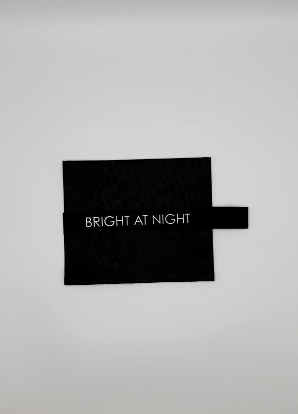 Funda TNT 100 gr. con cinta de 100% algodón, BRIGHT AT NIGHT negra, asa para colgar. También incluye elástico para tubos de alcohol.