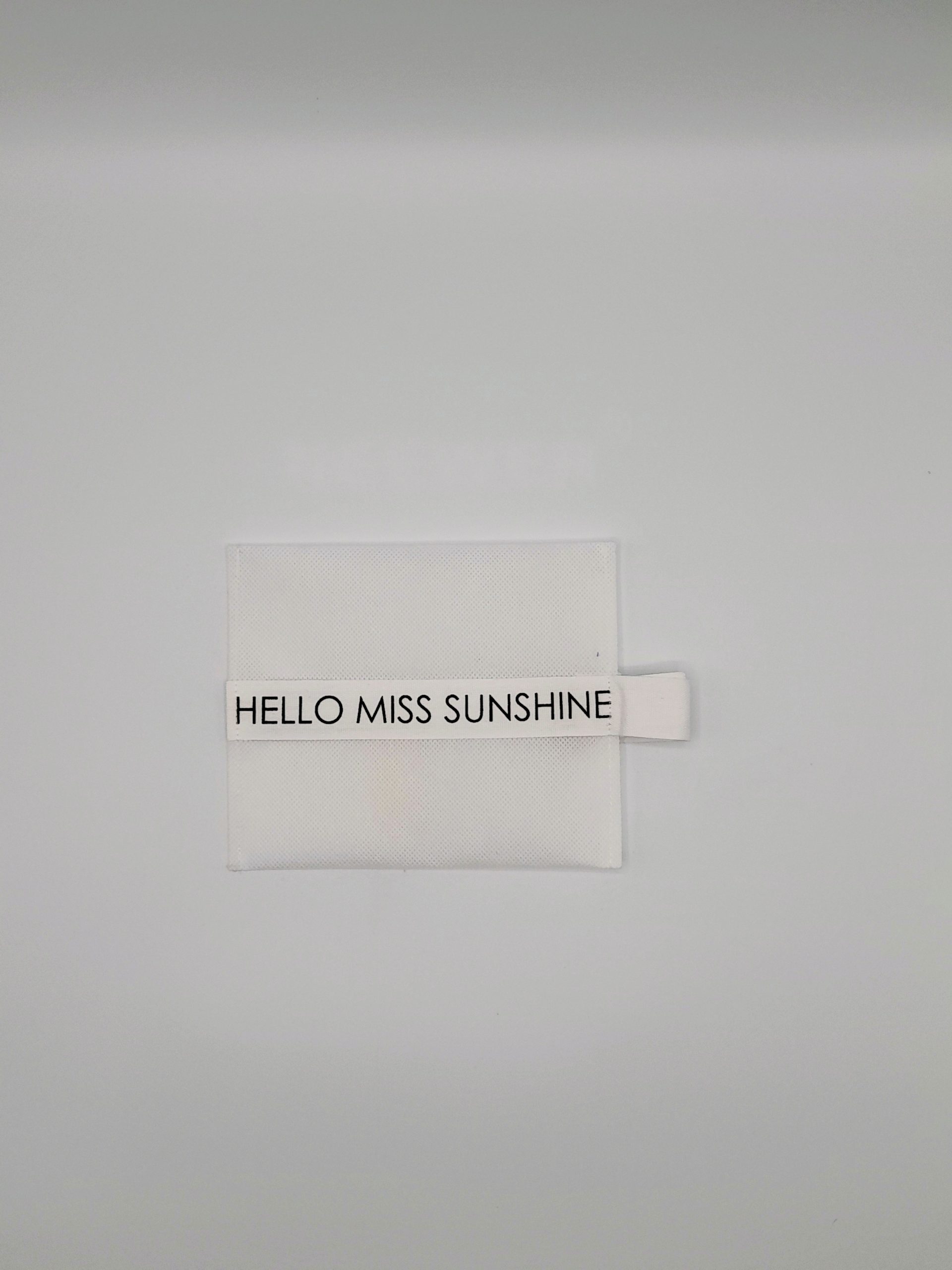 Funda TNT 100 gr. con cinta de 100% algodón, HELLO MISS SUNSHINE, Blanca, asa para colgar. También incluye elástico para tubos de alcohol. Un buen Uso de las Mascarilla es guardarla en su funda protectora cuando no la llevamos puesta. La funda también sirve para llevar los recambios, sugeridos cambiar cada 4 hs.