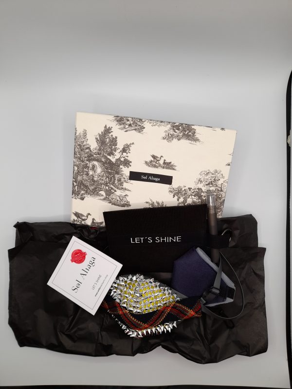 Mascarilla de Diseño Rock Star con Bozal de ecopiel Gris. Sujeción con arnés superior desmontable y orejas con elástico quirúrgico, correa incorporada. Diseño rock Star con pinchos Palteados. Incluye cinta Lets shine, 3 protectores intercambiables y cinta Vintage.