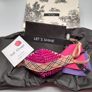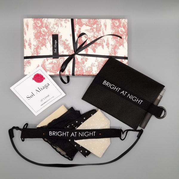 Kit de Mascarillas de Diseño modelo Bright at Night, cinta de 100% algodón desmontable, con swaroskis incrustados. 3 protectores intercambiables de base de TNT 100 gr doble capa. Dos con capa superior de Tul de topitos y una de encaje Negro desmontable, resultando 4 opciones diferentes para combinar. Correa de Eco-piel con velcro para colgar mascarilla al cuello. Funda a juego con cinta, asa para colgar con mosquetón.También incluye elástico para tubos de alcohol.