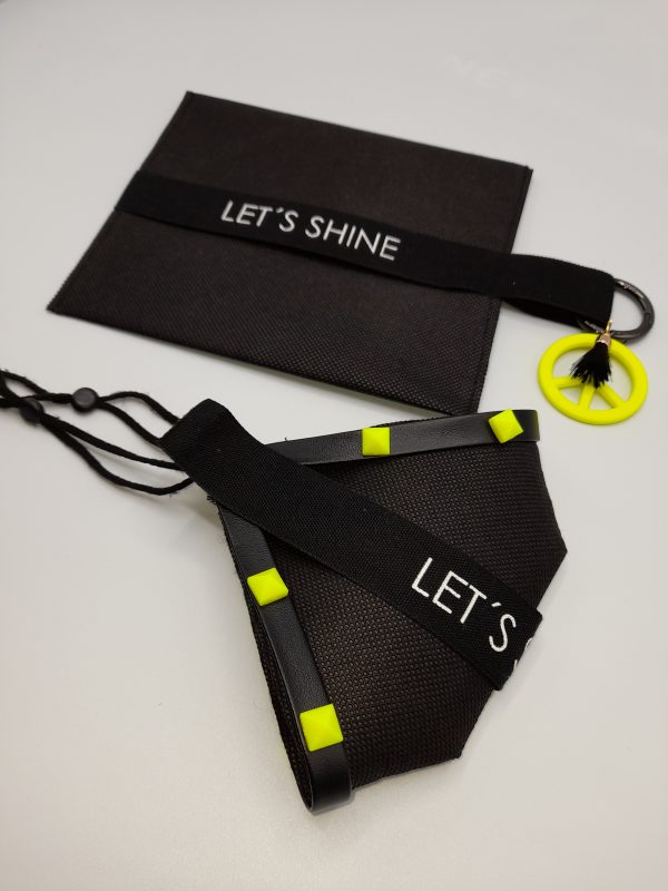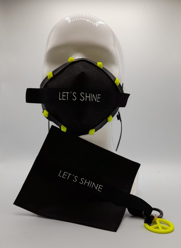 Mascarilla de Diseño modelo Bozal Ecopiel Negro, Sueción de orejas y correa incorporada. Tachuelas Pirámide de ABS color Amarillo Flúor. Protector de TNT Color Negro 03.
