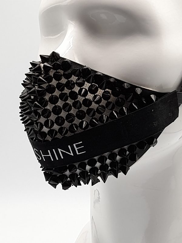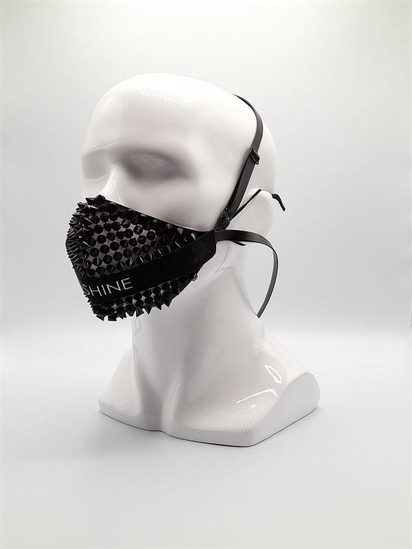 Mascarilla de Diseño modelo Bozal EcopielNegro, Arnés superior desmontable y correa incorporada. Pinchos de ABS color Negro. Protector de TNT Color Blanco.