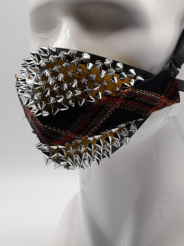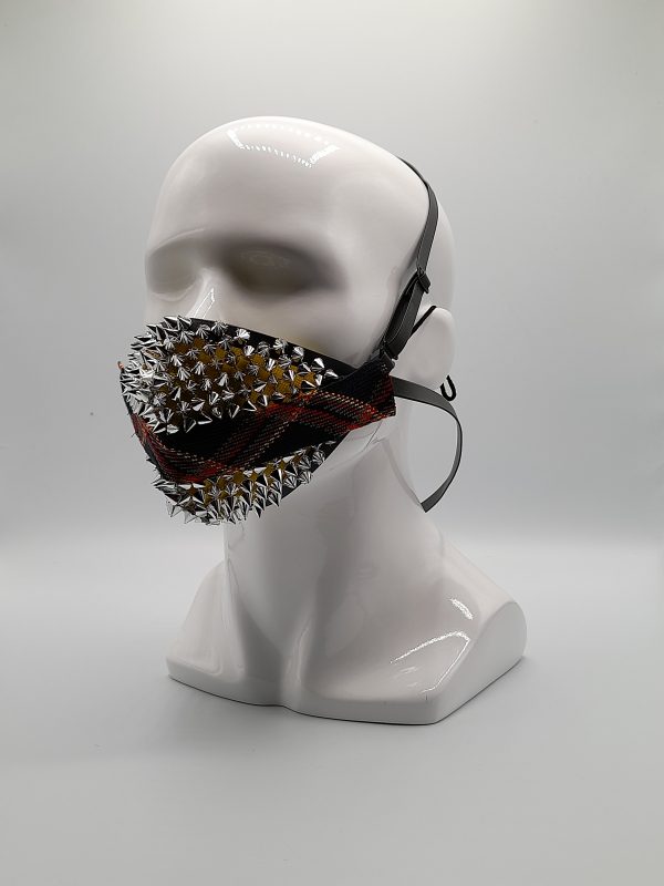Mascarilla de Diseño modelo Bozal Ecopiel Gris Marino, Arnés superior desmontable y correa incorporada. Pinchos de ABS color Plateado. Protector de TNT Color Blanco.