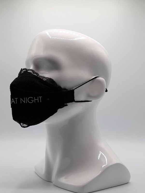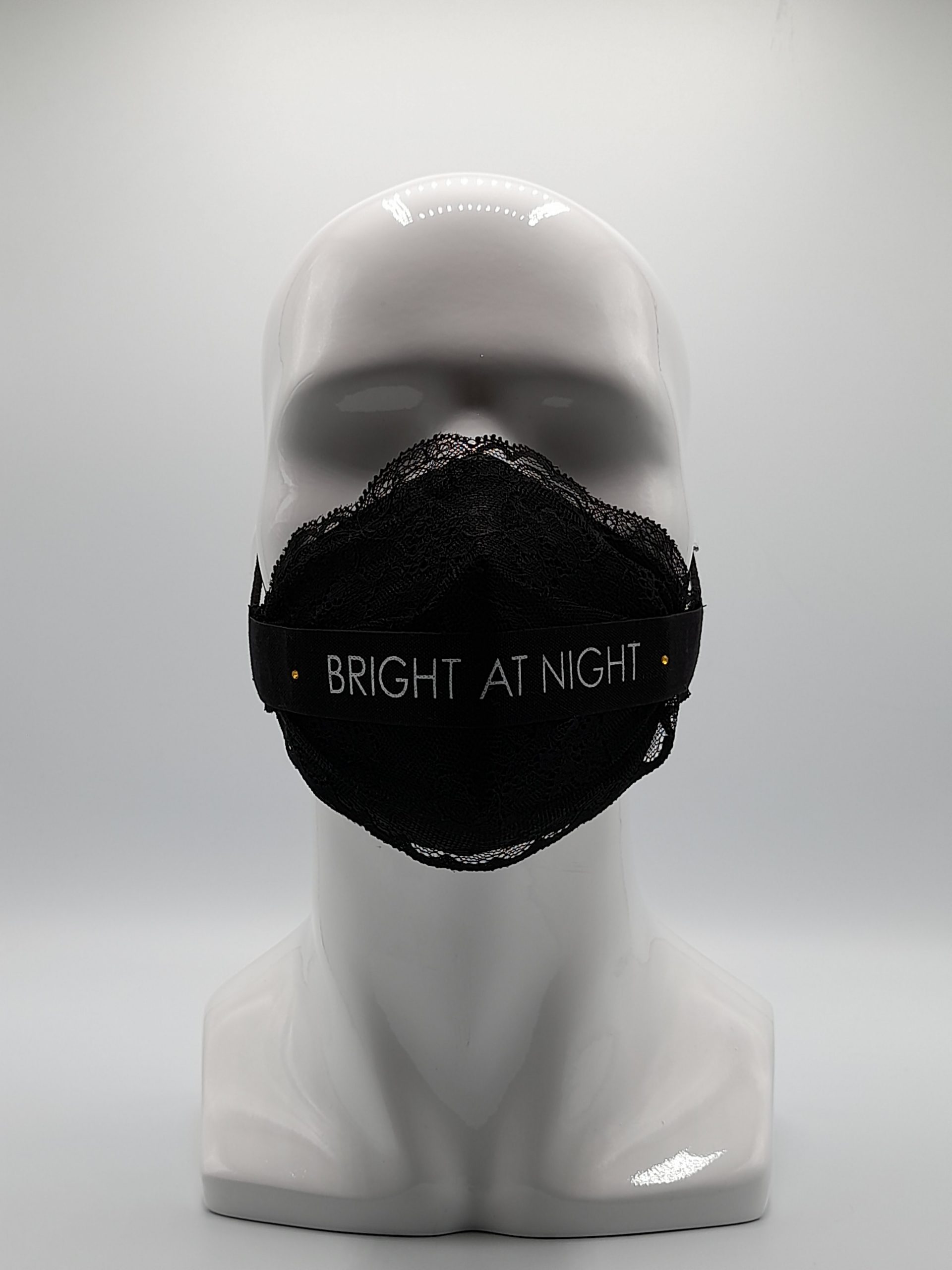 Mascarilla de Diseño cinta Negra BRIGHT AT NIGHT, sujeción de orejas con elástico quirúrgico. Protector intercambiable base de TNT 100 gr. doble Negro, exterior capa de encaje desmontable Negro.