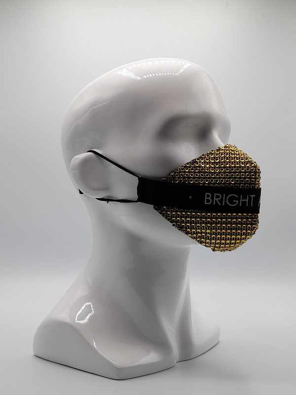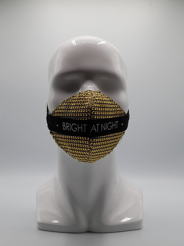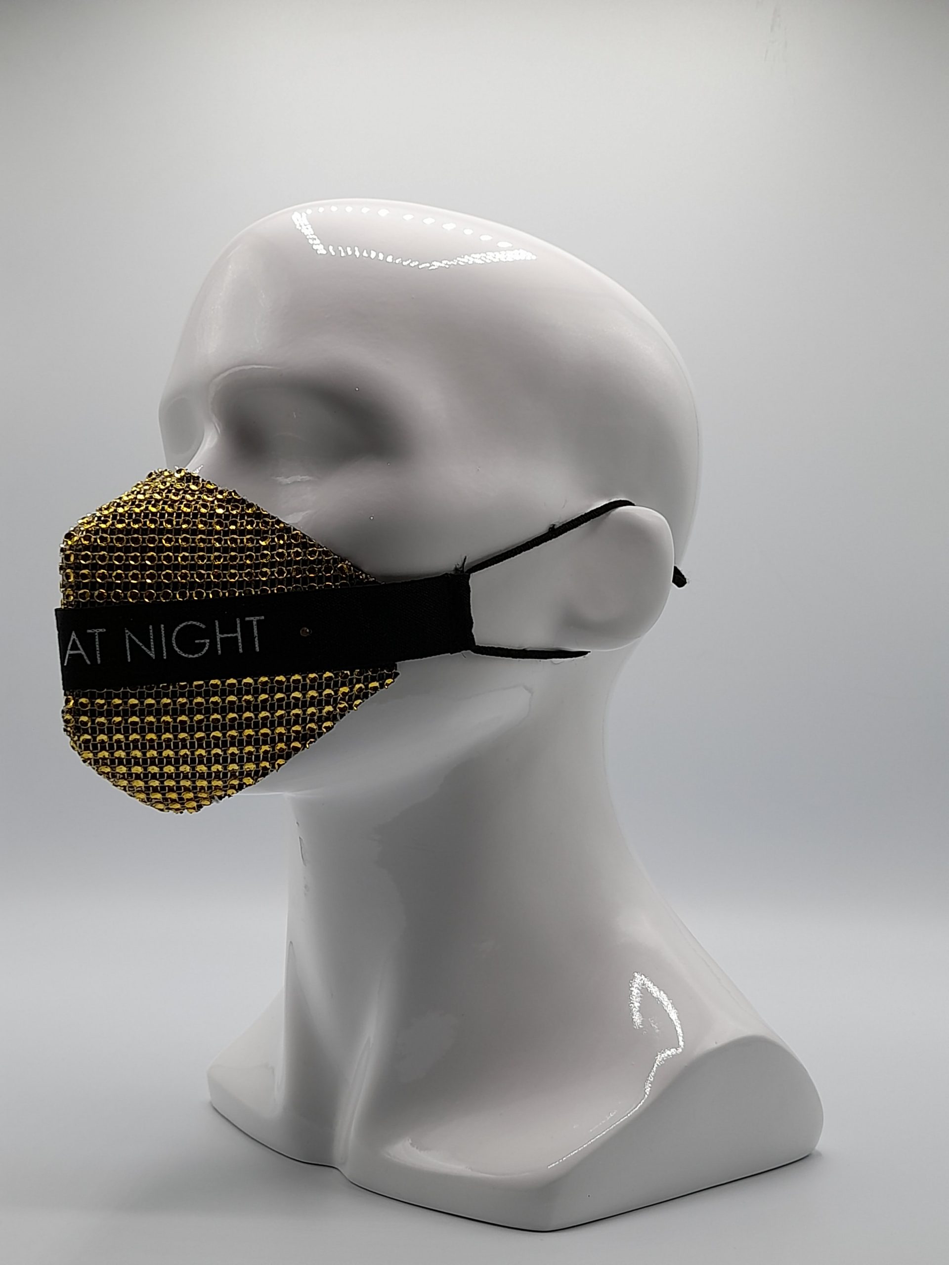 Mascarilla de Diseño cinta Negra BRIGHT AT NIGHT, sujeción de orejas con elástico quirúrgico. Protector intercambiable base de TNT 100 gr. doble capa Negro, exterior malla plástica con brillos dorado.