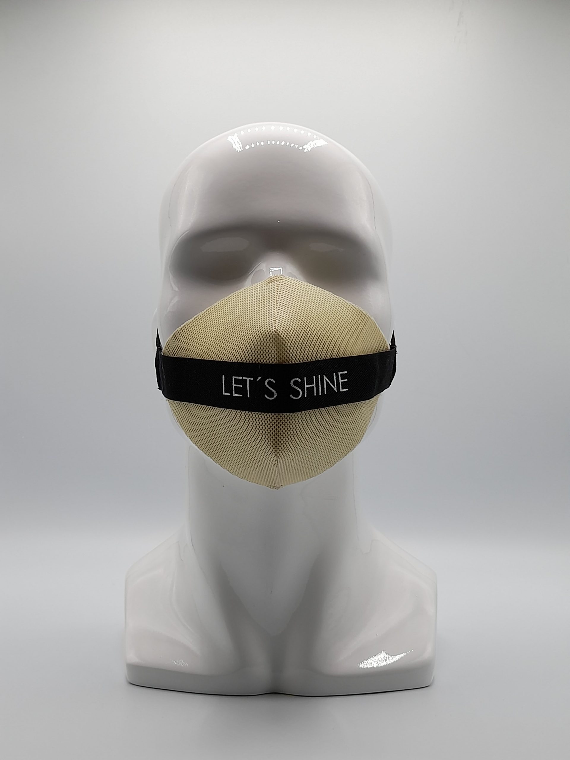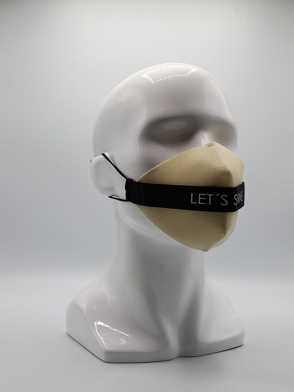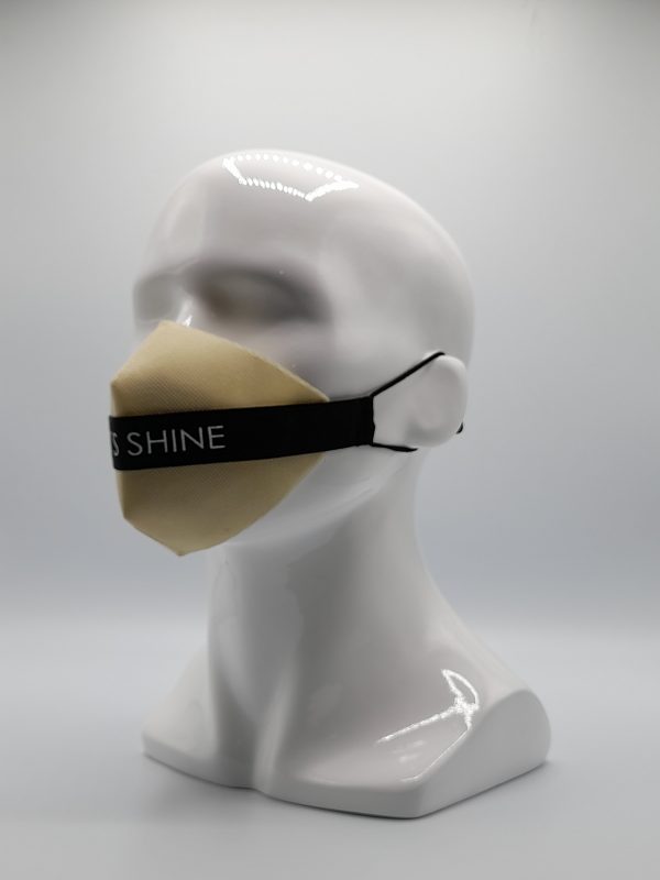 Mascarilla de Diseño cinta Negra LET´S Shine, sujeción de orejas con elástico quirúrgico.Protector intercambiable de TNT 100 gr. doble capa color Beige.