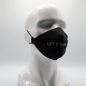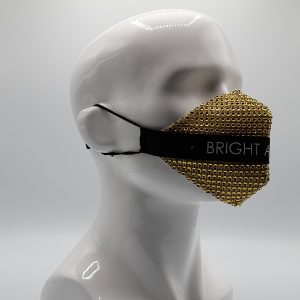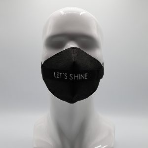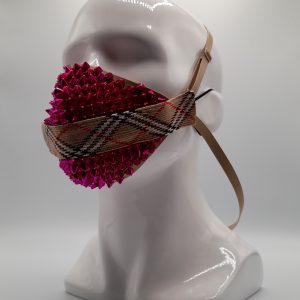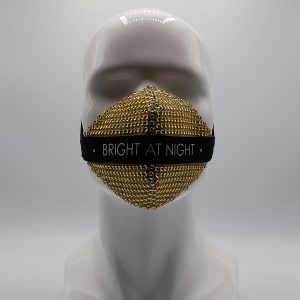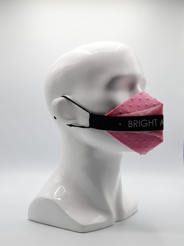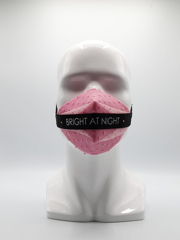 Mascarilla de Diseño cinta Negra BRIGHT AT NIGHT, sujeción de orejas con elástico quirúrgico. Protector intercambiable de TNT 100 gr. doble capa y capa exterior de Tul de topitos Rosa.